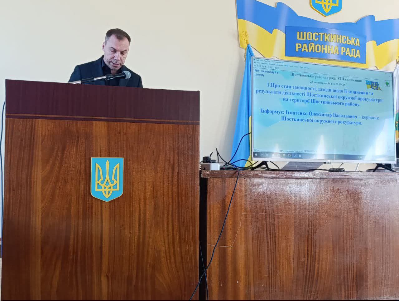 У ході сесії заслухали керівника Шосткинської окружної прокуратури про стан законності, заходи щодо її зміцнення та результати діяльності Шосткинської окружної прокуратури на території Шосткинського району.