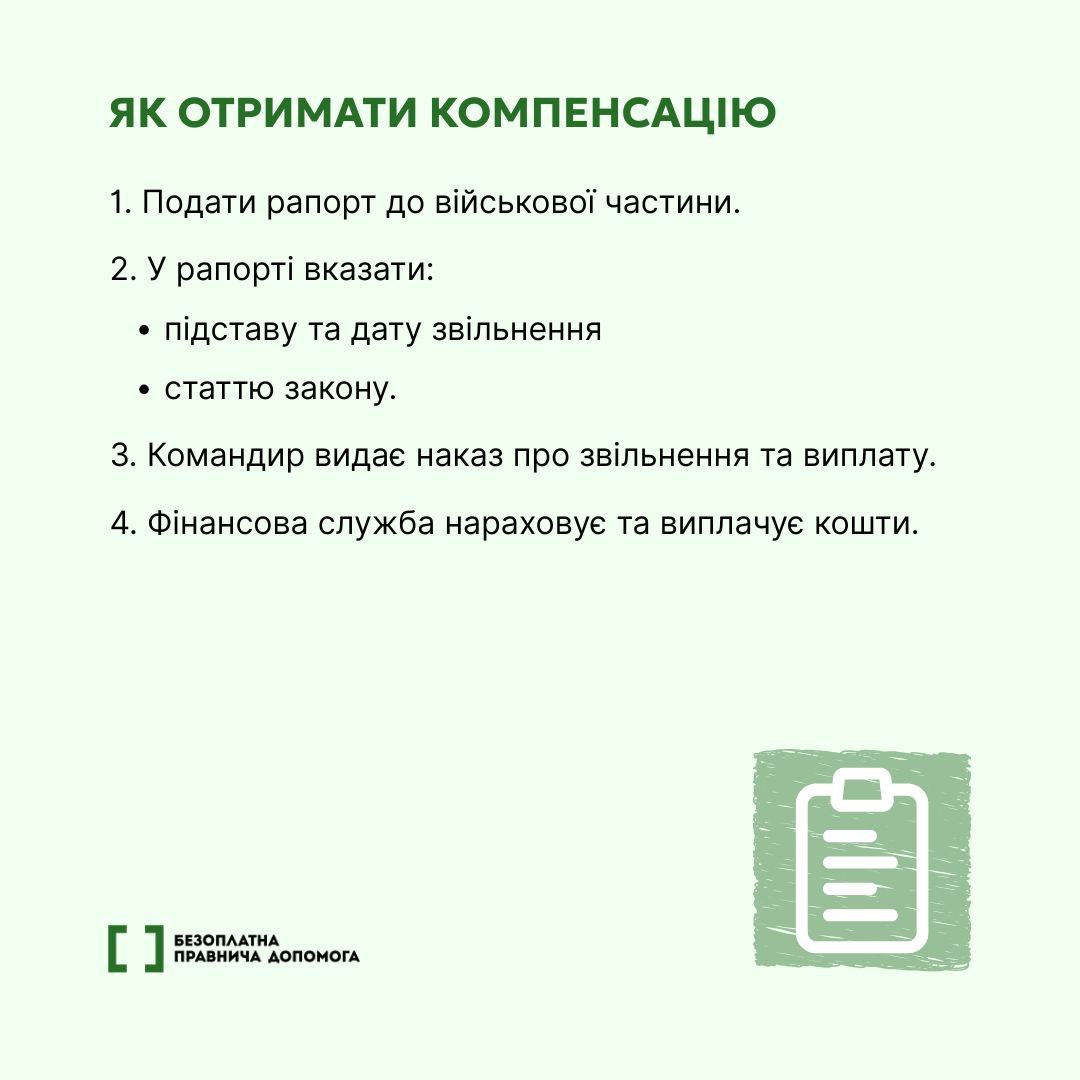 При звільненні зі служби, військові мають право на компенсацію невикористаної відпустки. Це передбачено статтею 10-1 Закону України “Про соціальний і правовий захист військовослужбовців та членів їх сімей”: https://zakon.rada.gov.ua/laws/show/2011-12#Text